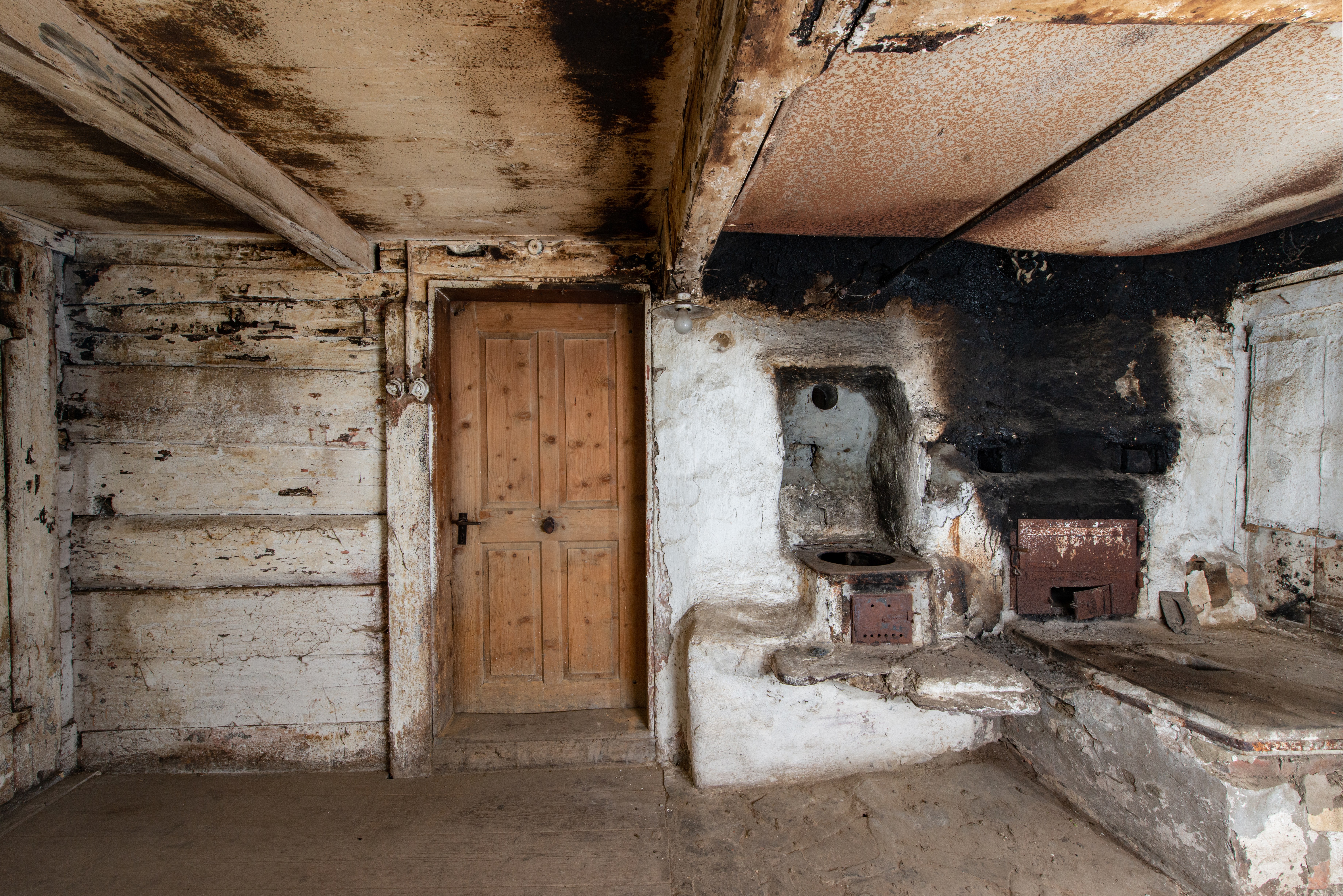Die Blockwand besteht aus 14cm bis 28cm hohen Balken. Die Fugen sind mit Zeitung ausgestopft. Die Balken sind weiss gestrichen, darunter jedoch russig.